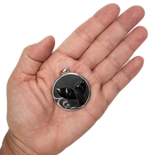 Black Serpentine Whale Tail Pendant With Silver Wave Frame - 1 pc. (J145)
