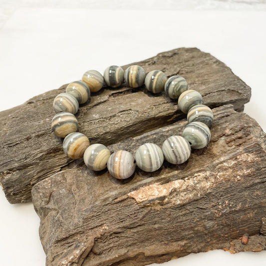Saturn Chalcedony 13mm Bead Stretchy Bracelet Yellow & Gray (GEM5)