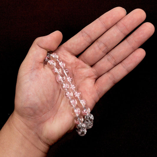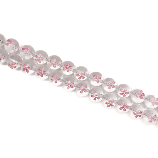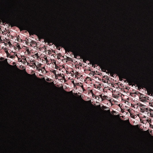 Crystal Quartz with Etched Pink Sakura Blossom 10mm Round Bead - 7.5" Strand