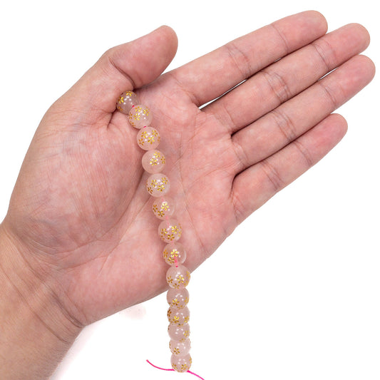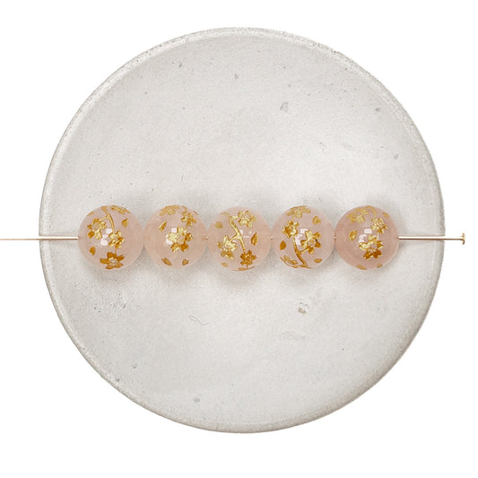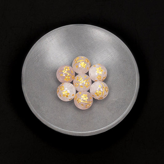 Rose Quartz Etched Gold Sakura Shower 10mm Round Bead - 7.5" Strand