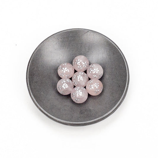 Rose Quartz Etched Silver Sakura Shower 10mm Round Bead - 7.5" Strand