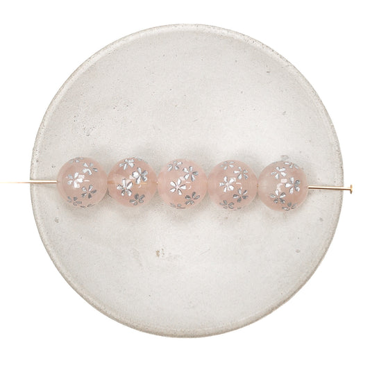 Rose Quartz Etched Silver Sakura Shower 10mm Round Bead - 7.5" Strand