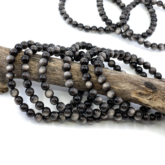 Silver Sheen Obsidian Stretchy Cord Bracelet - 6mm Round