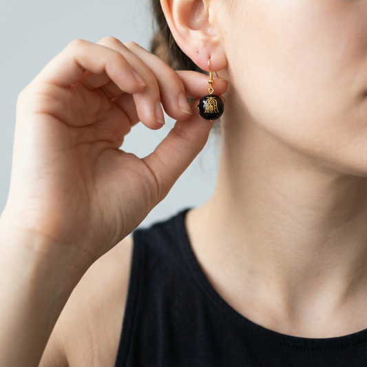 Gold Protection Symbols on Black Agate 10mm Smooth Round Bead - 7.25" Strand (GEM2459)