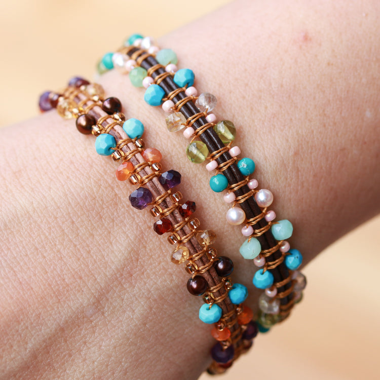 Love Story is a macrame knotting technique of adding tiny gemstones onto a leather bracelet band, with a thin nylon cord! Super fun and easy for a first-time project! The very first one I made was inspired by a trip to the mainland, and I wanted to take a project for my mom and me to make that needed very little supplies and NO tools so we could work on the plane or in the hotel - so I "kitted" these up and off I went!
