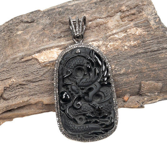 Carved Black Obsidian Dragon Pendant with Diamond (Oxidized Sterling Silver) - 1 pc. (J82)