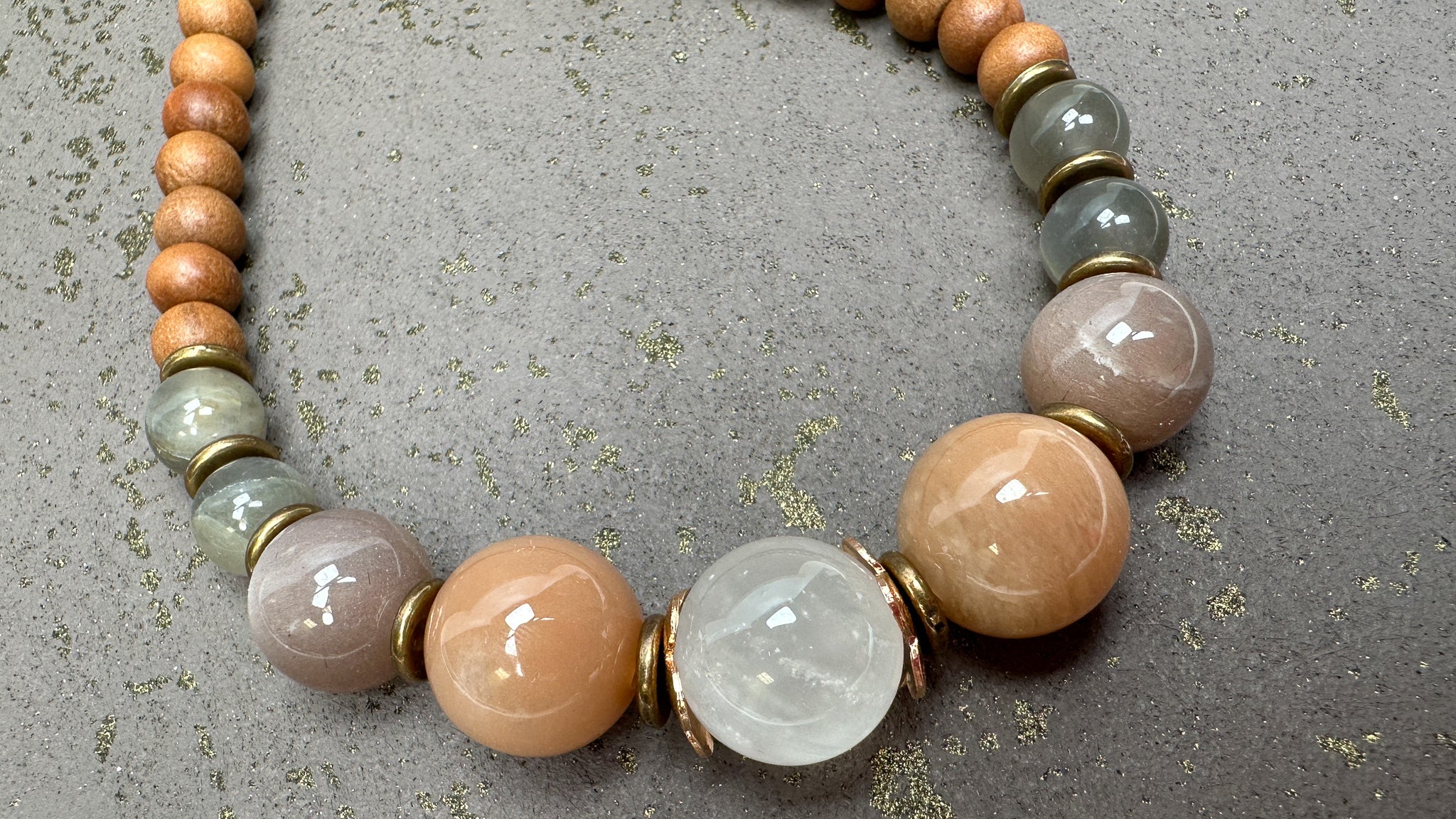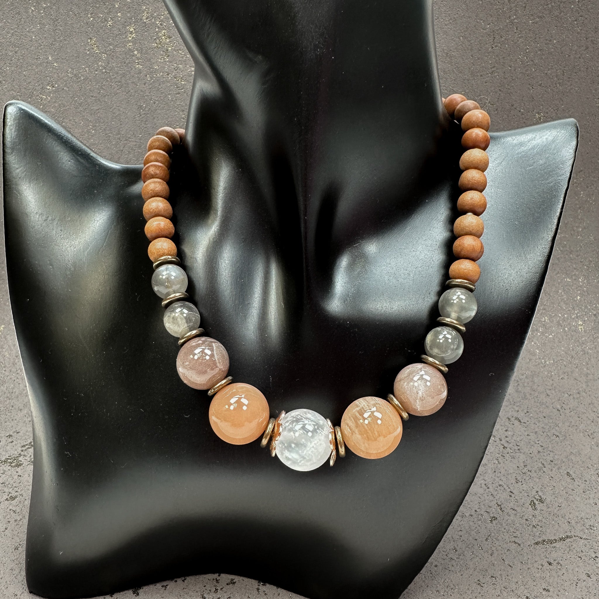 We combined 4 of our favorite moonstone colors: PEACH, WHITE, CHOCOLATE AND GRAY to make this very special blend. It mixes well with wood, so you can create a simple necklace right away!