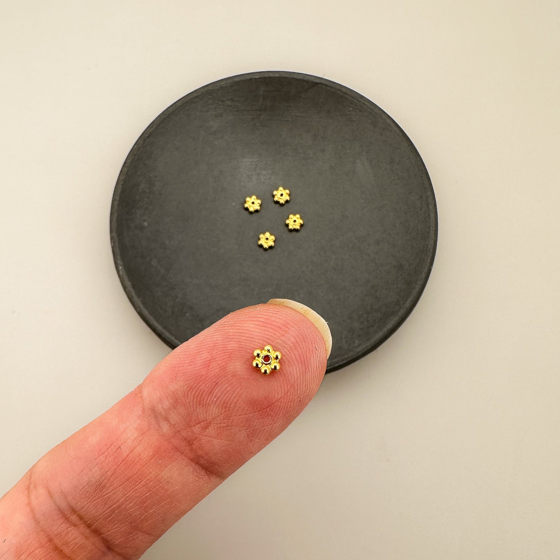 These 3mm Daisy Spacer Beads in gold vermeil (gold over sterling silver) add a petite flower detail and warm glow between gemstones, pearls, or glass—perfect for polishing bracelets, necklaces, and earrings