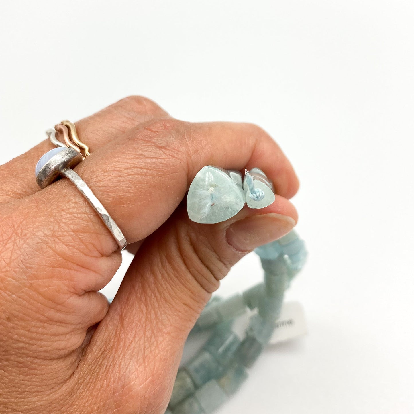 Lovely aquamarine in a shape I've never seen before. it's a 3-sided cut, so they can't roll away. Aquamarine is the birthstone for March, and its color comes from iron (turning it pretty shades of blue or green). Roughly translated as "the water of the sea," it's a great reminder of being in the ocean to bring peace, relaxation, and calm.
