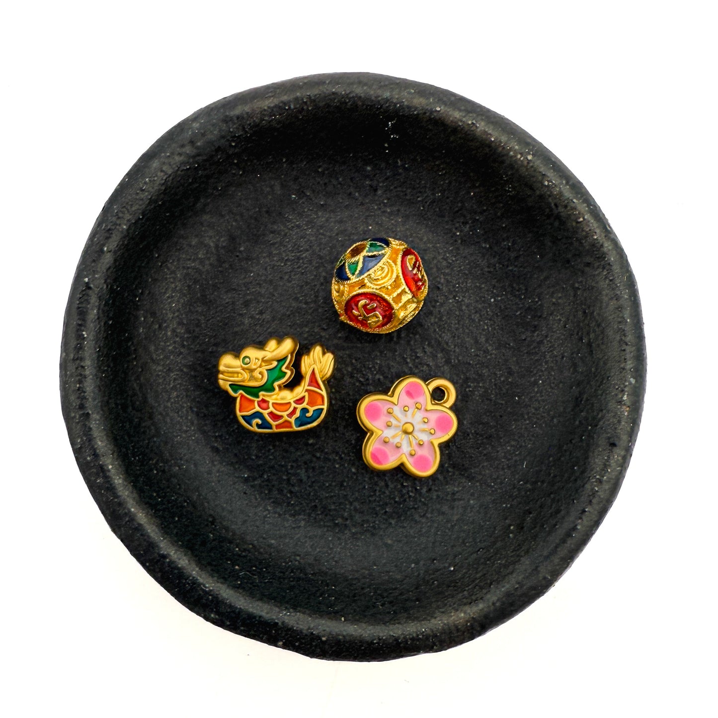 This symbolic set brings together three meaningful elements of good fortune, strength, and renewal in Chinese and Japanese traditions. The blessings bead features auspicious Chinese characters symbolizing luck, peace, and prosperity, while the dragon bead represents power, wisdom, and protection. Completing the set, the sakura cherry blossom charm embodies beauty, transformation, and the fleeting nature of life.