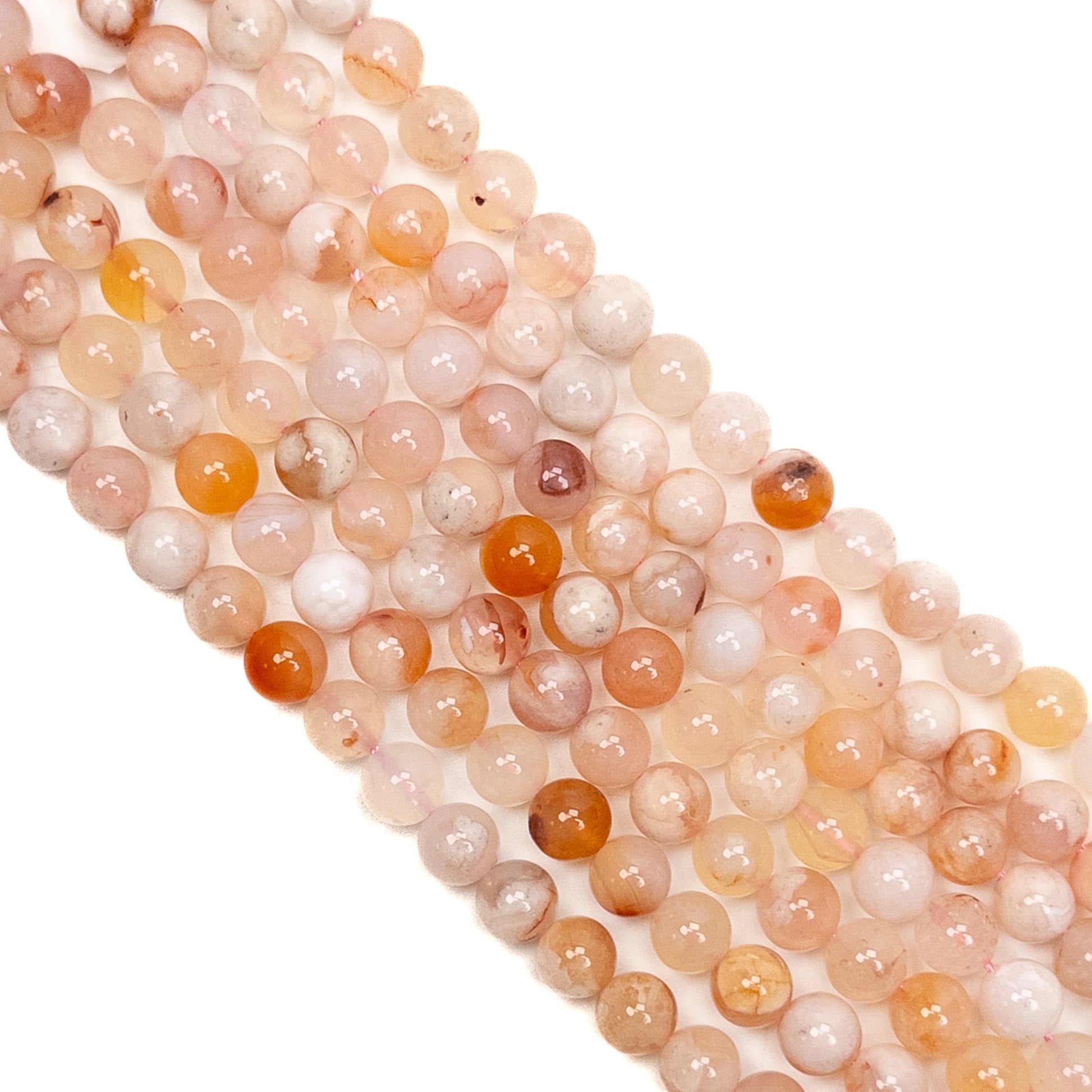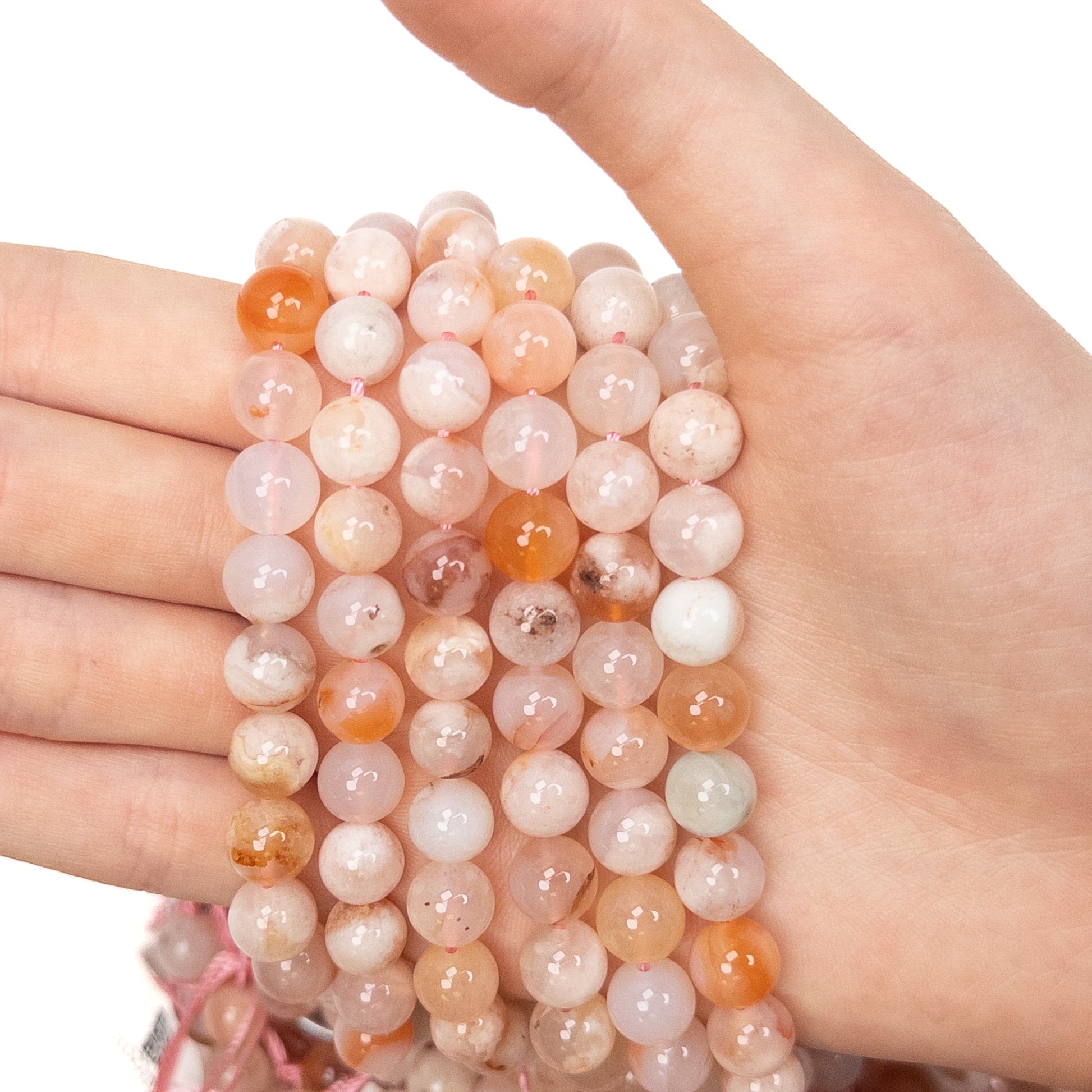 Such a beautiful color with pink agate filled with chalcedony - giving it that look of tiny blossoming flowers! There's a presence of orange tangerine and light pinks mixed with cloudy white chalcedony that brings a fresh and happy feel to these beads!