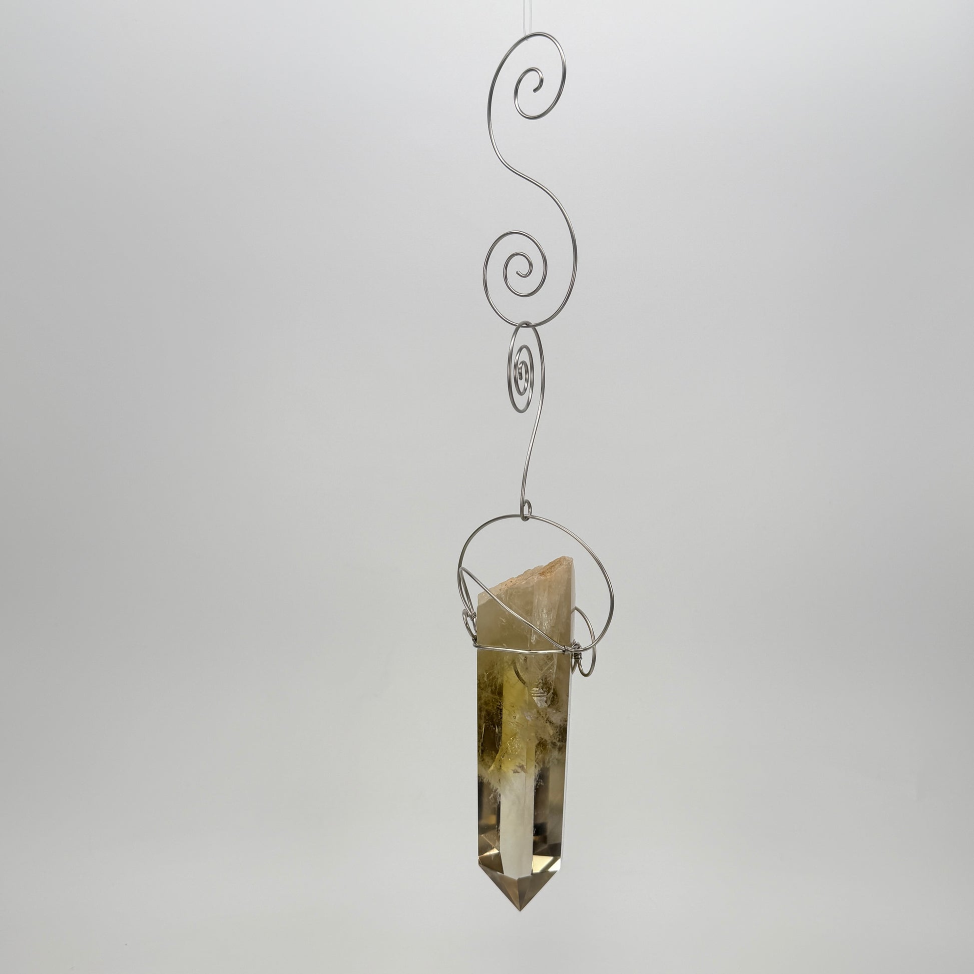Infuse your home with vibrant energy and abundance with this stunning handmade citrine lightcatcher. Featuring a large citrine specimen, carefully wrapped in delicate wire swirls, this piece radiates positivity and warmth.