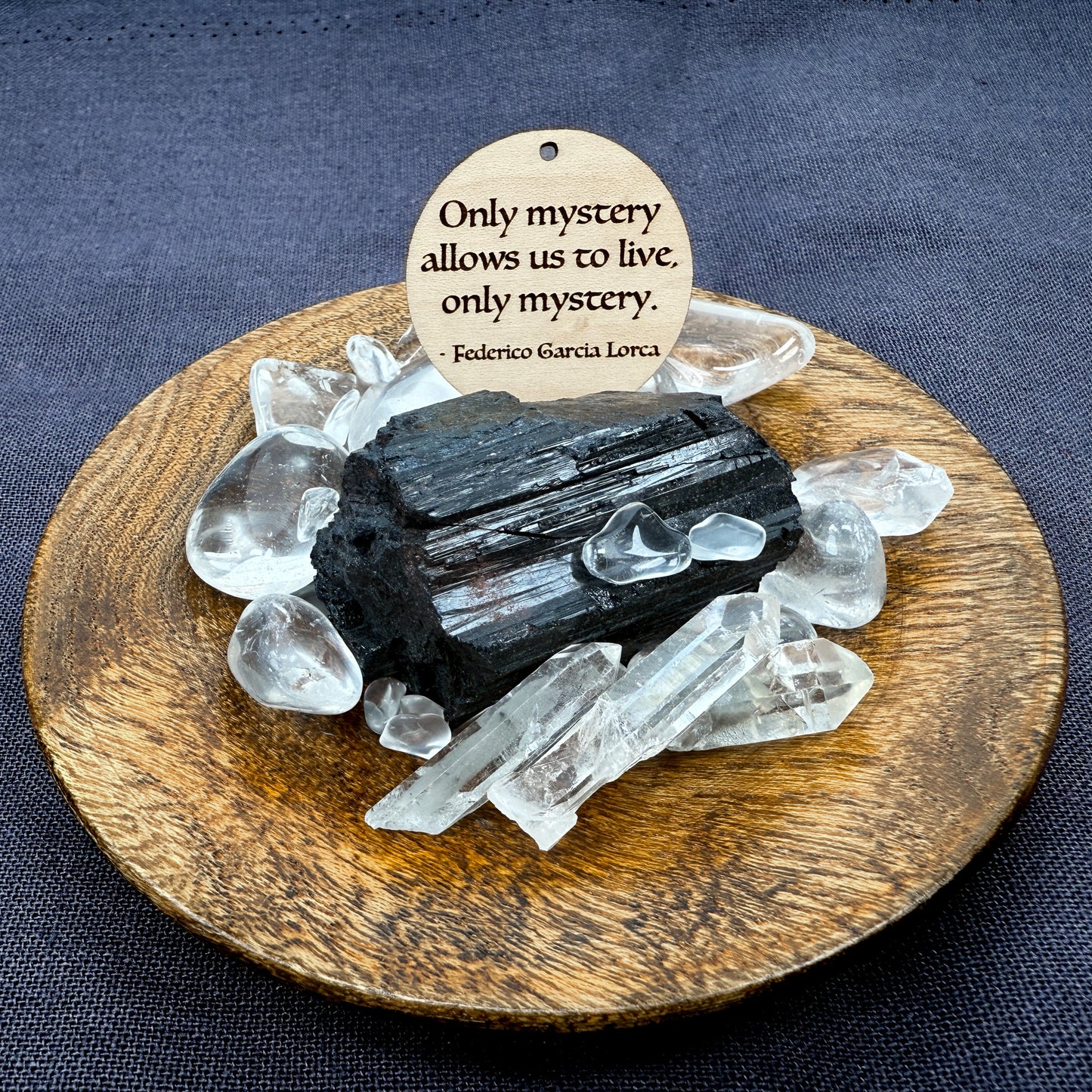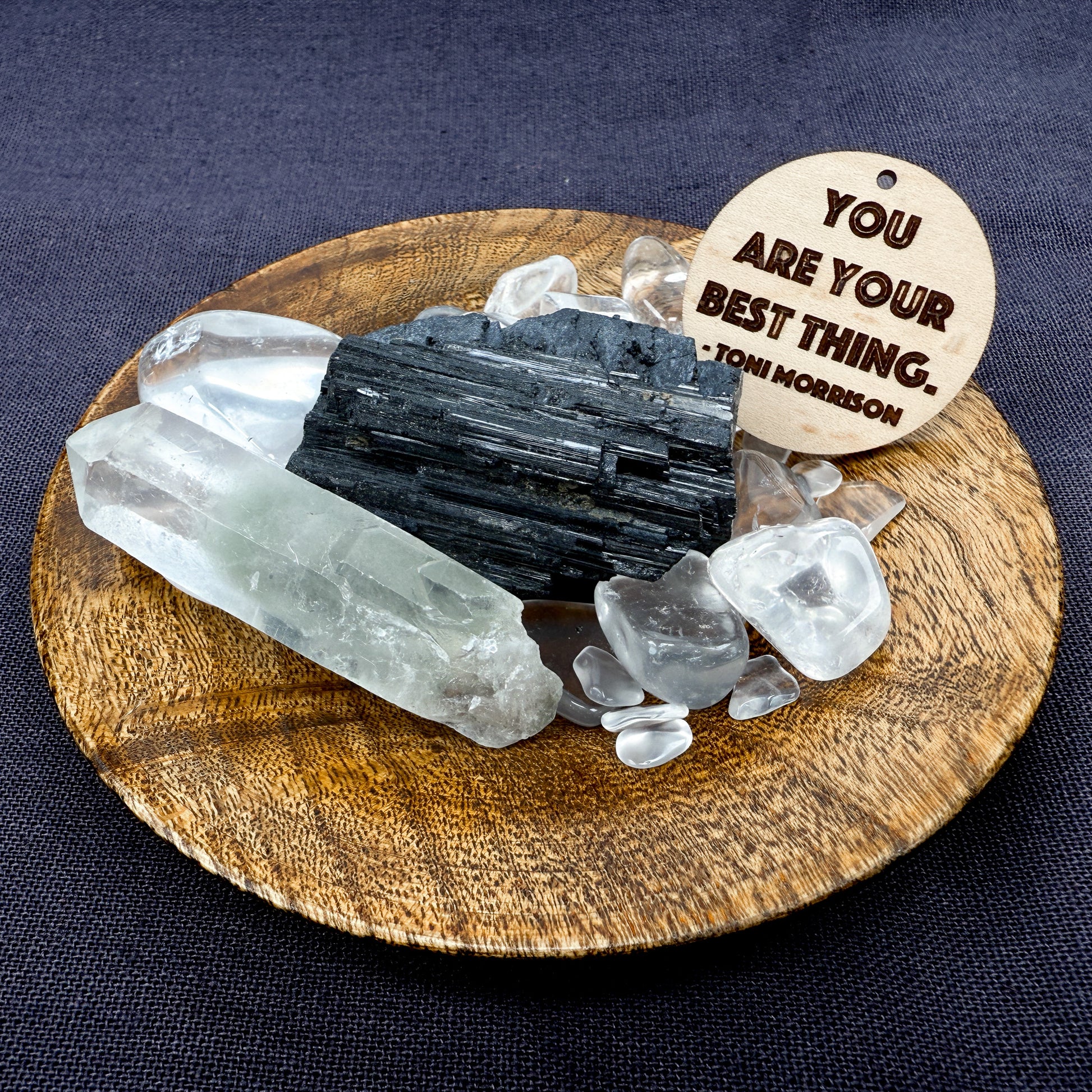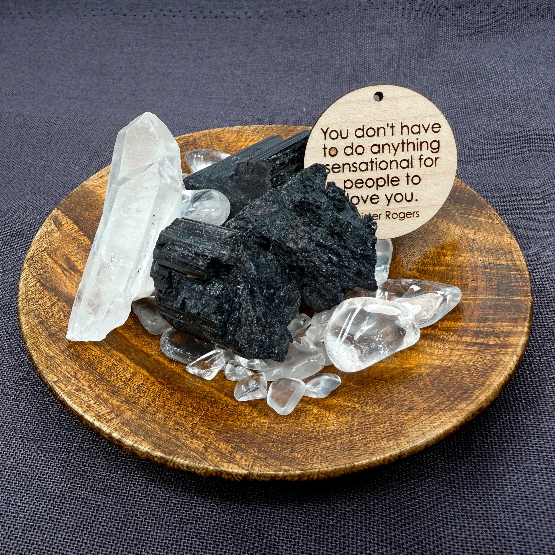 - Every set is unique: Wood grain, tourmaline texture, quartz shapes, and even the quote placement can vary. The one you receive is truly yours alone.