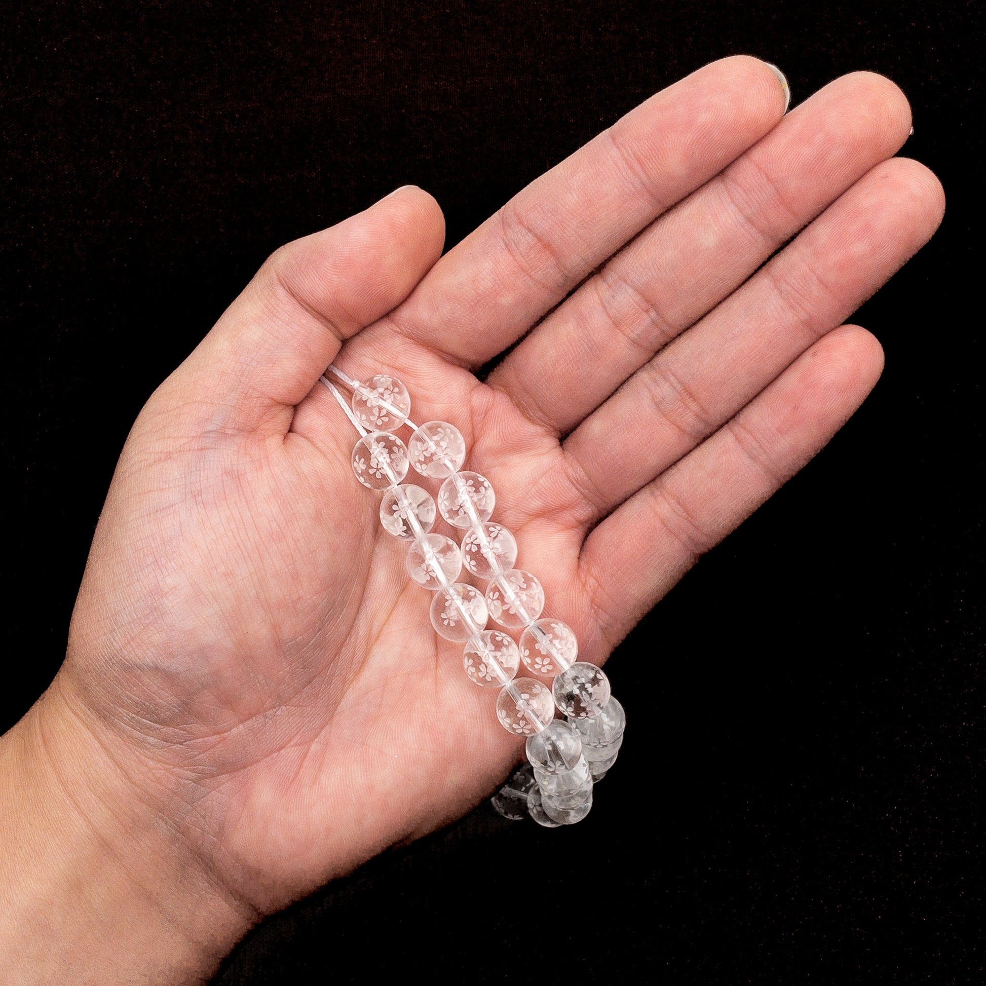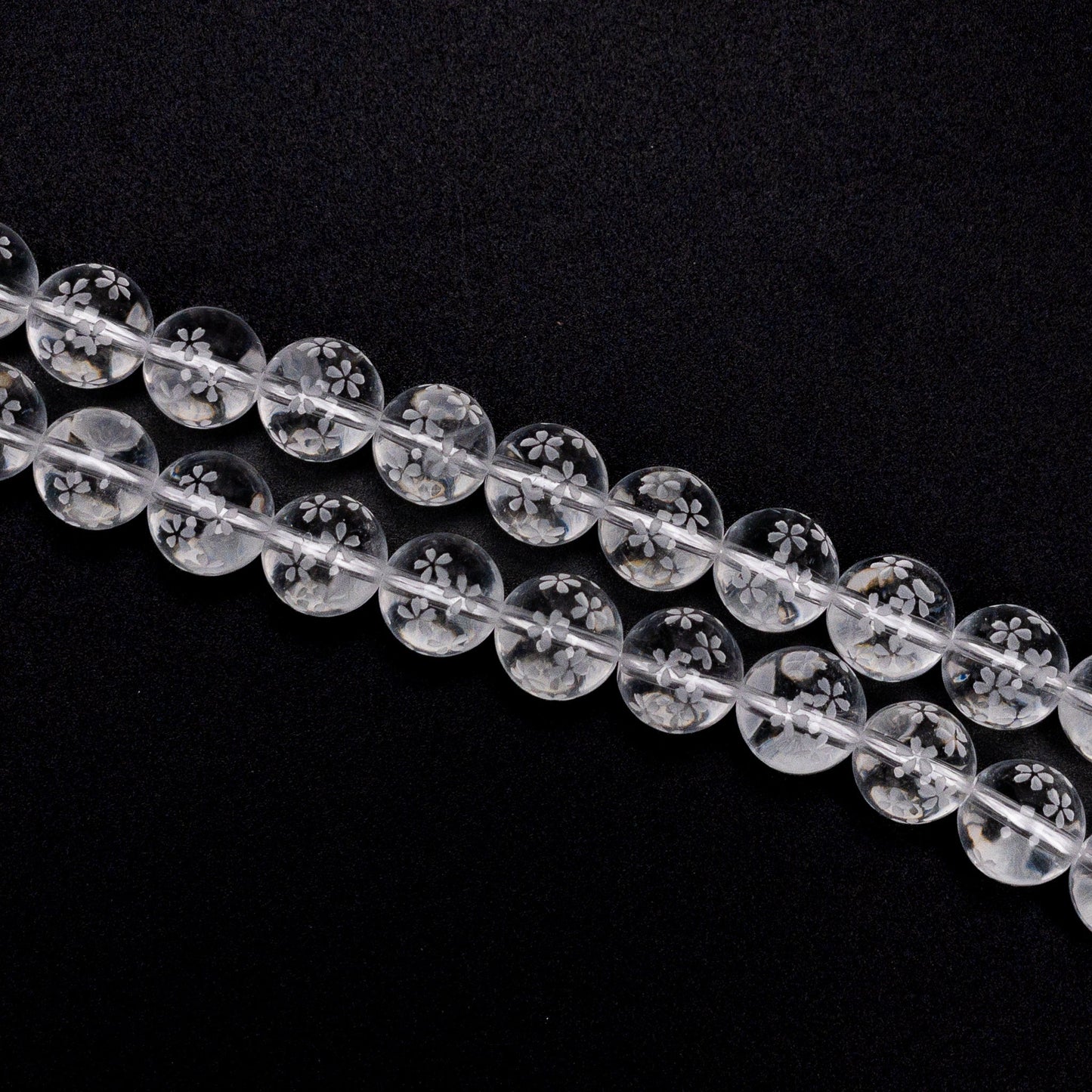 Crystal Quartz Etched Sakura Shower 10mm Round Bead - 7.5" Strand (GEM1705)