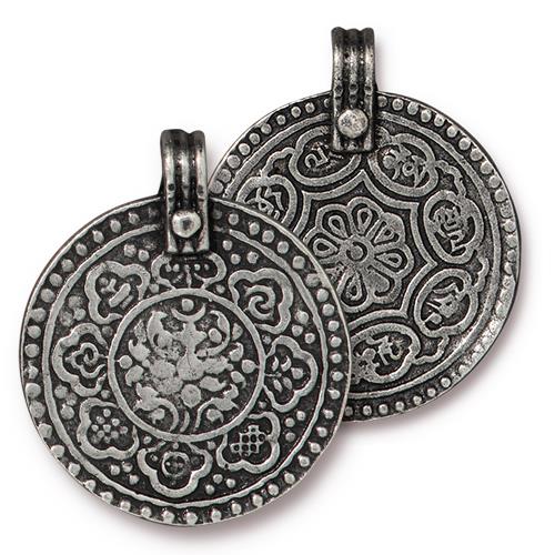 This double sided pendant represents the Ashtamangala, a group of eight auspicious symbols used as teaching tools in Buddhism and other Eastern religions. In Buddhism the various symbols represent the divine attributes of Buddha, including awakening, unity, breath and purity. The symbols themselves are popular themes in households and art.