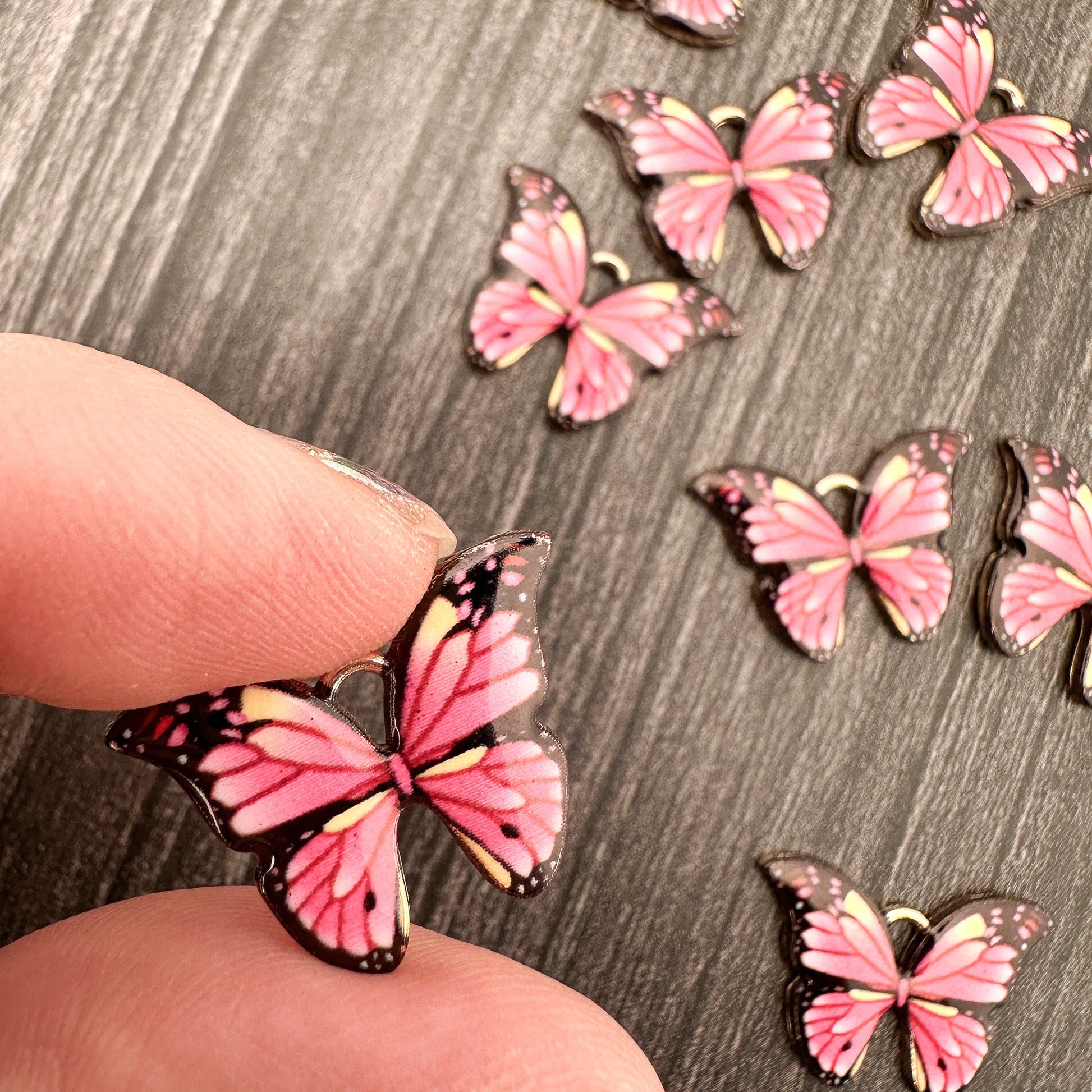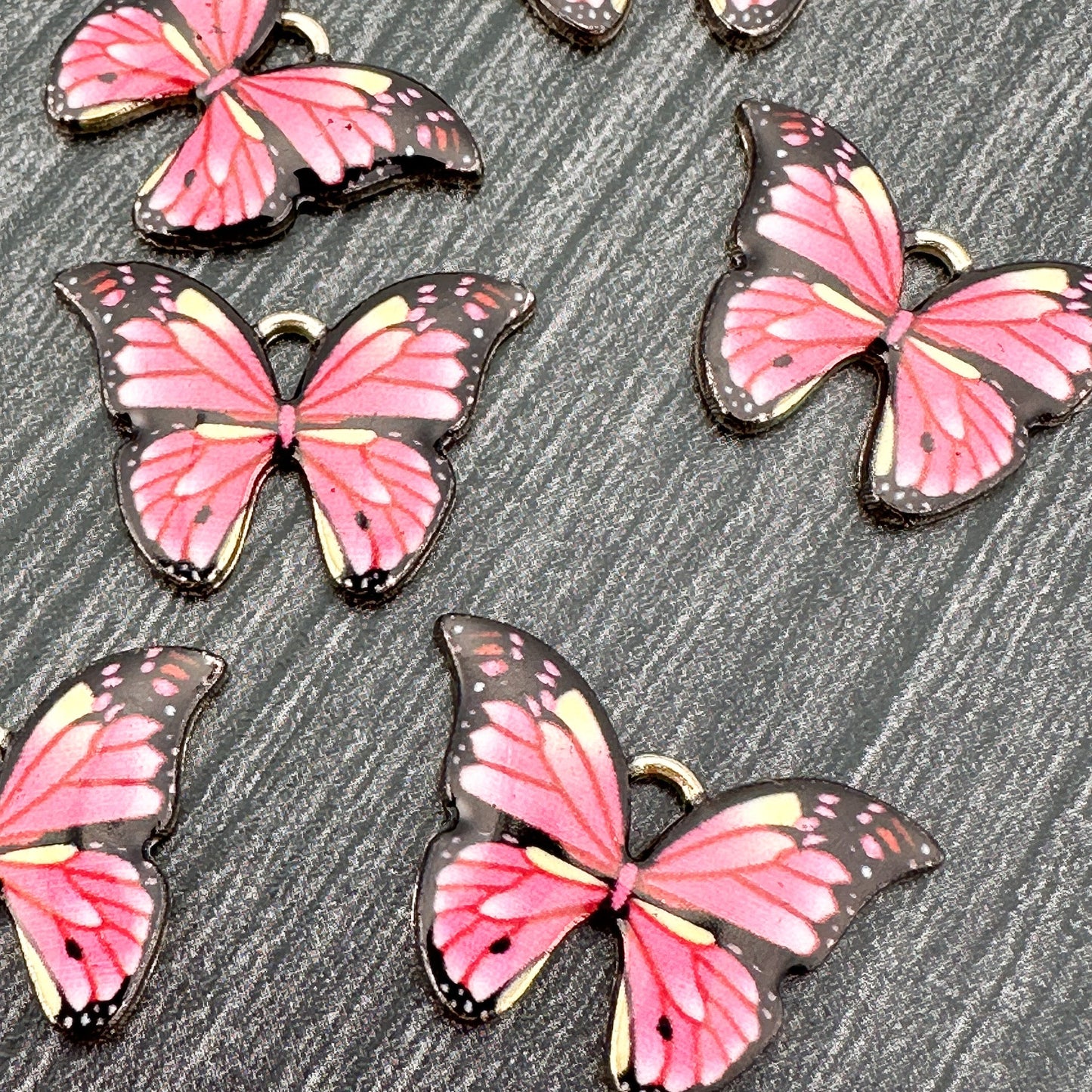 Delightful pink butterfly charms to add a touch of whimsy and femininity to your jewelry designs. Crafted from metal with a vibrant pink and yellow smooth enamel finish that catches the light beautifully. The detailing on the wings makes it extra sweet!