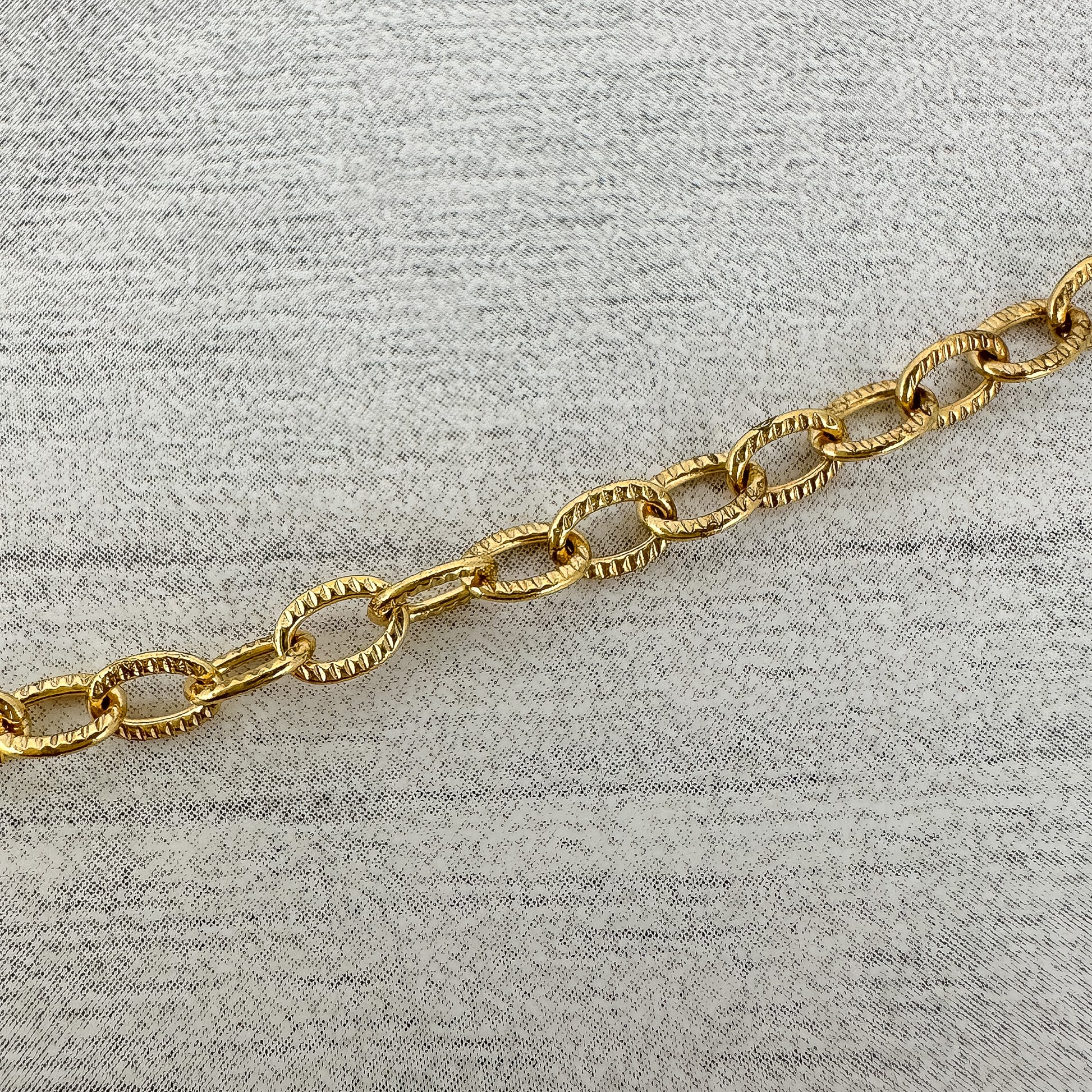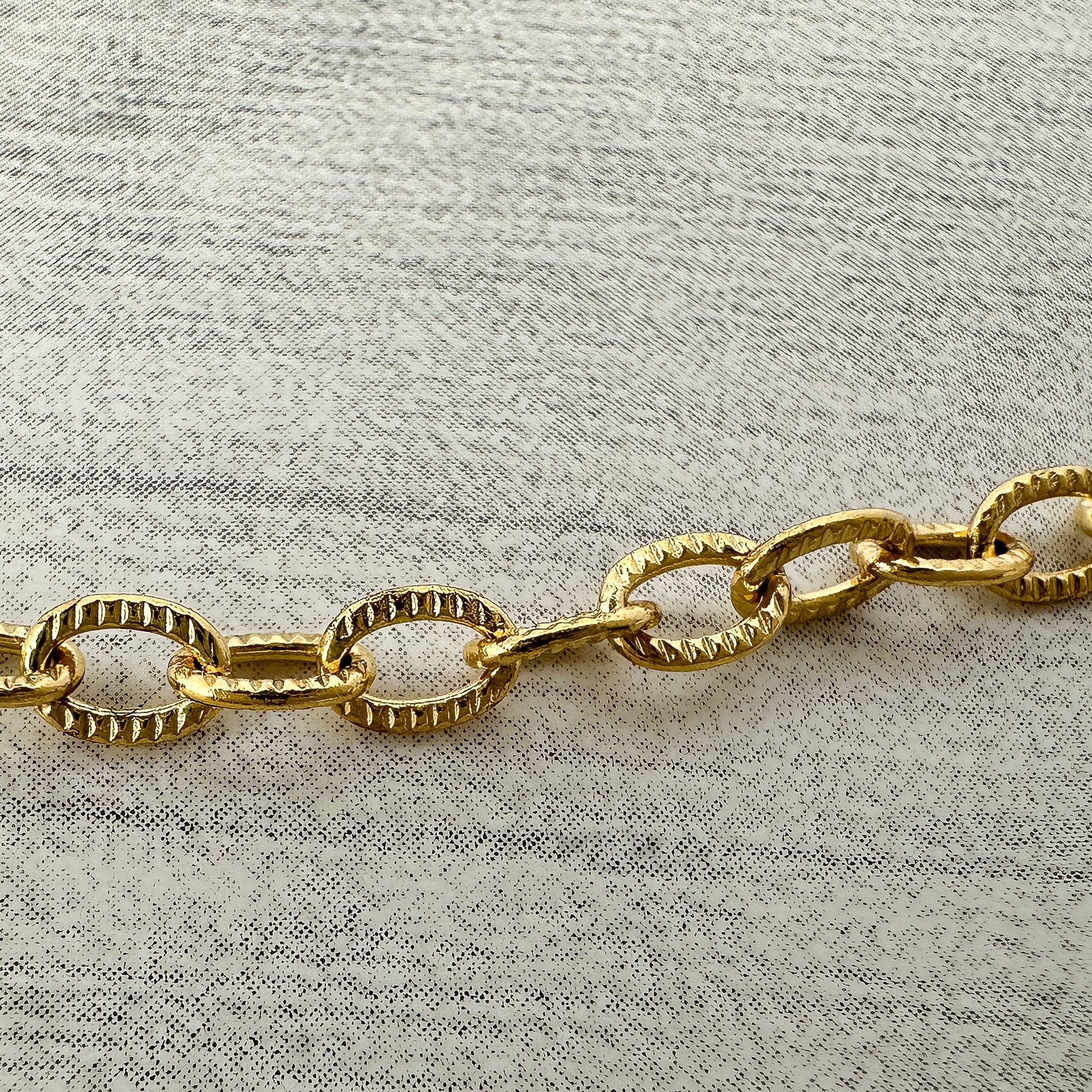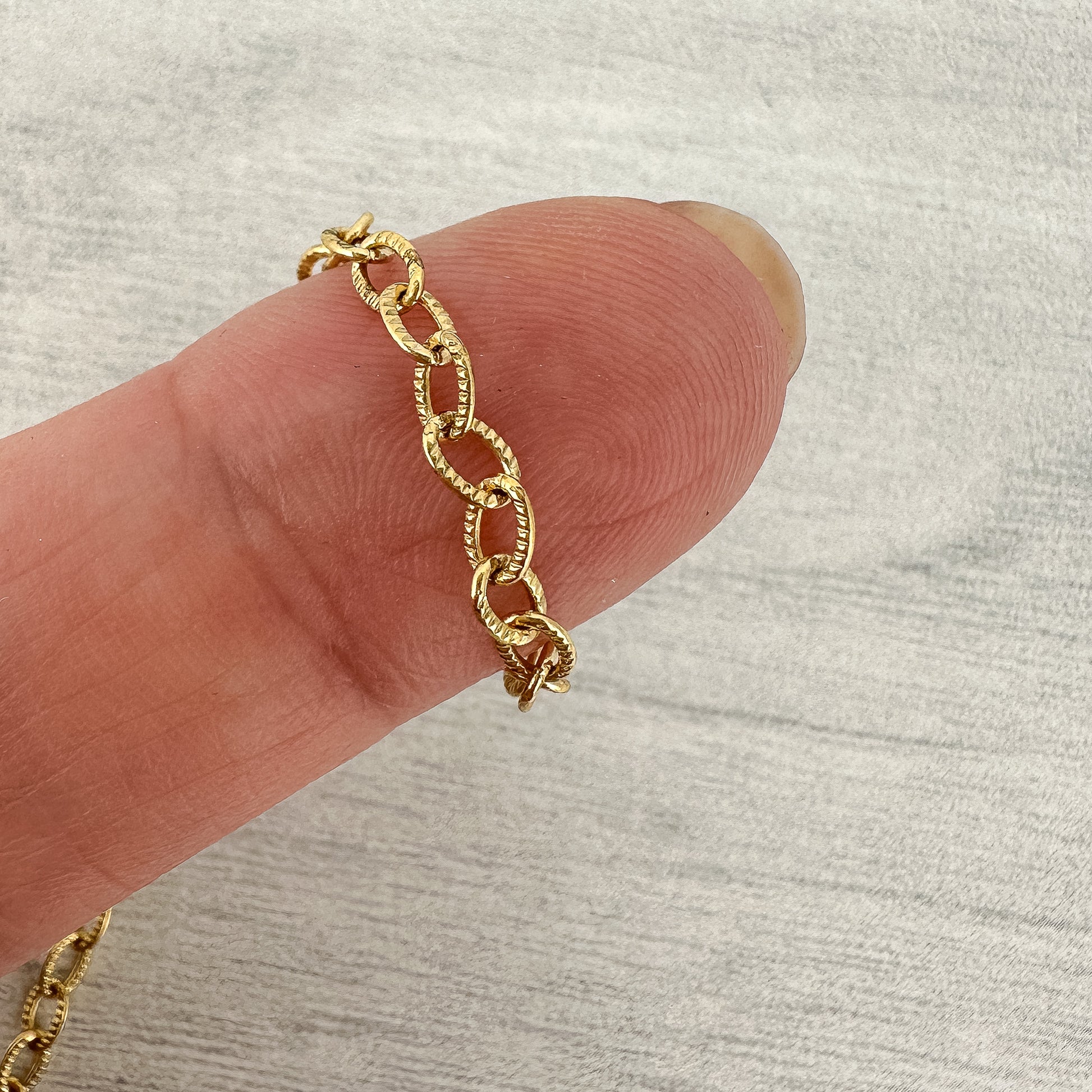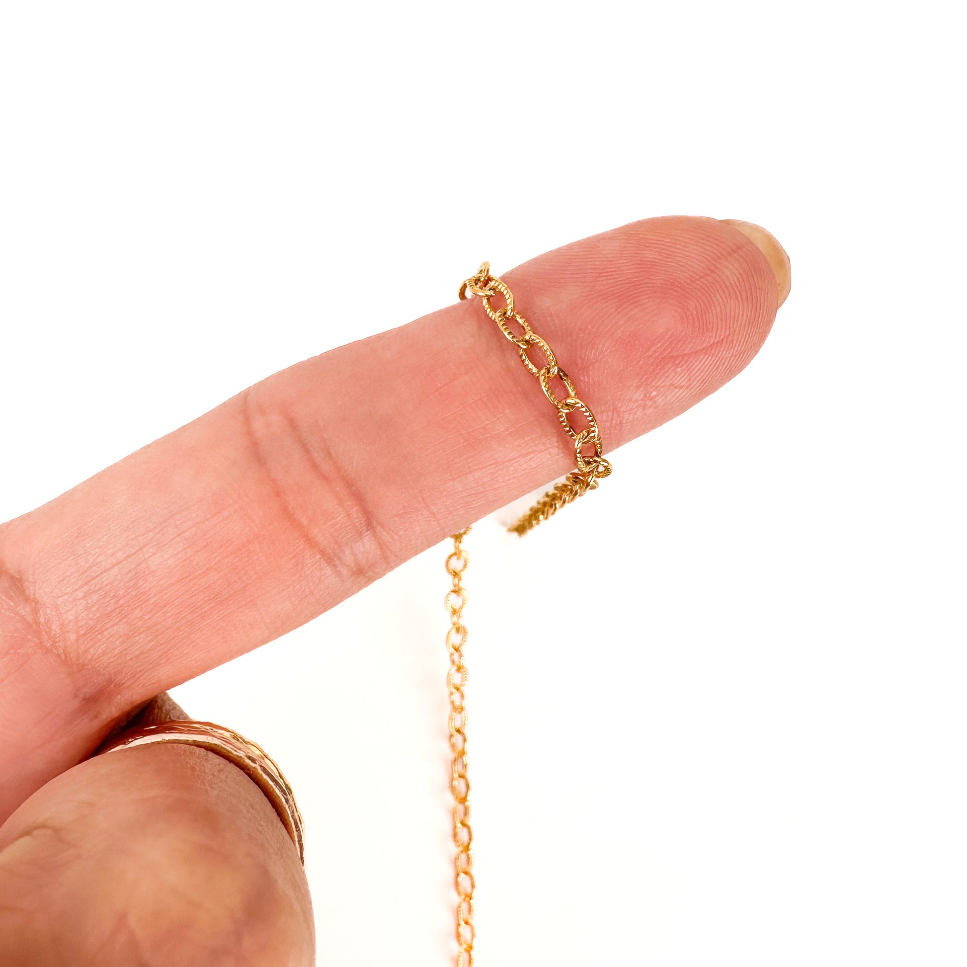Our best tester of our new gold plated chains, this has small links with an etched detailing, that is super sturdy, and road-tested for over 8 months straight!