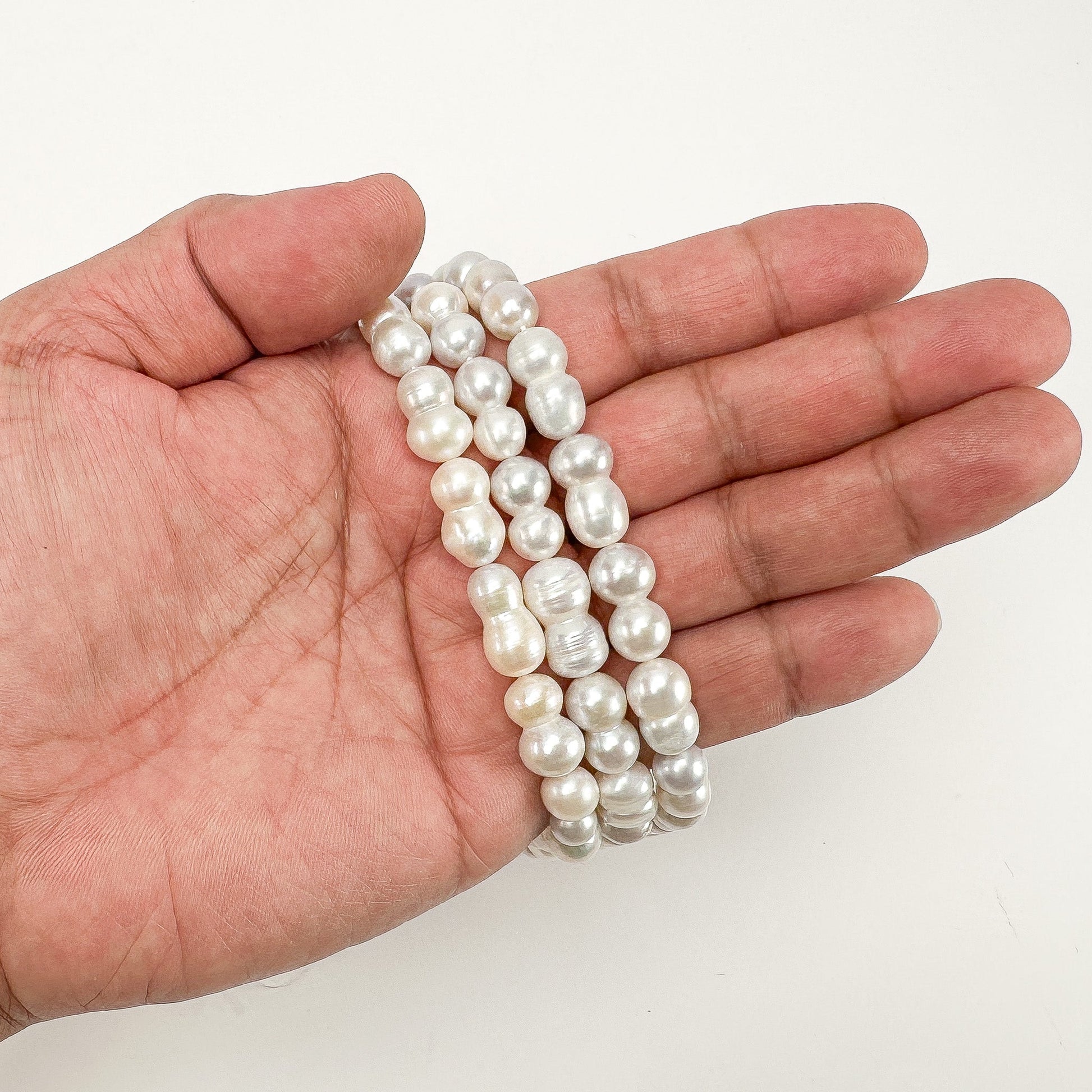 This double pearl "peanut" freshwater pearl shape is an amazing inspiration to make kokeshi dolls, snowmen, or any stacked shapes! So much fun, and each strand has more than enough to activate your imagination!