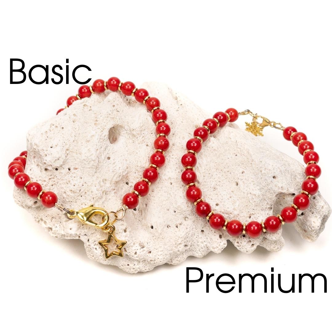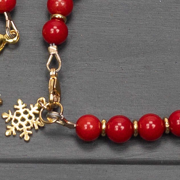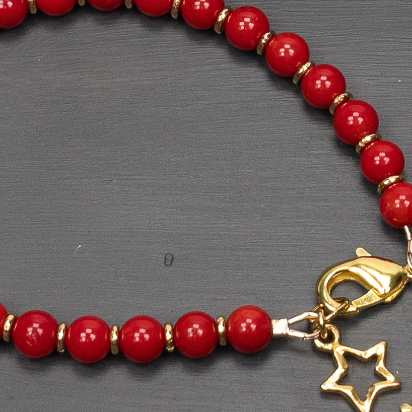 Celebrate with the colors of the season with this cheerful bracelet that features bright red 6mm dyed coral beads and gold plated accents.