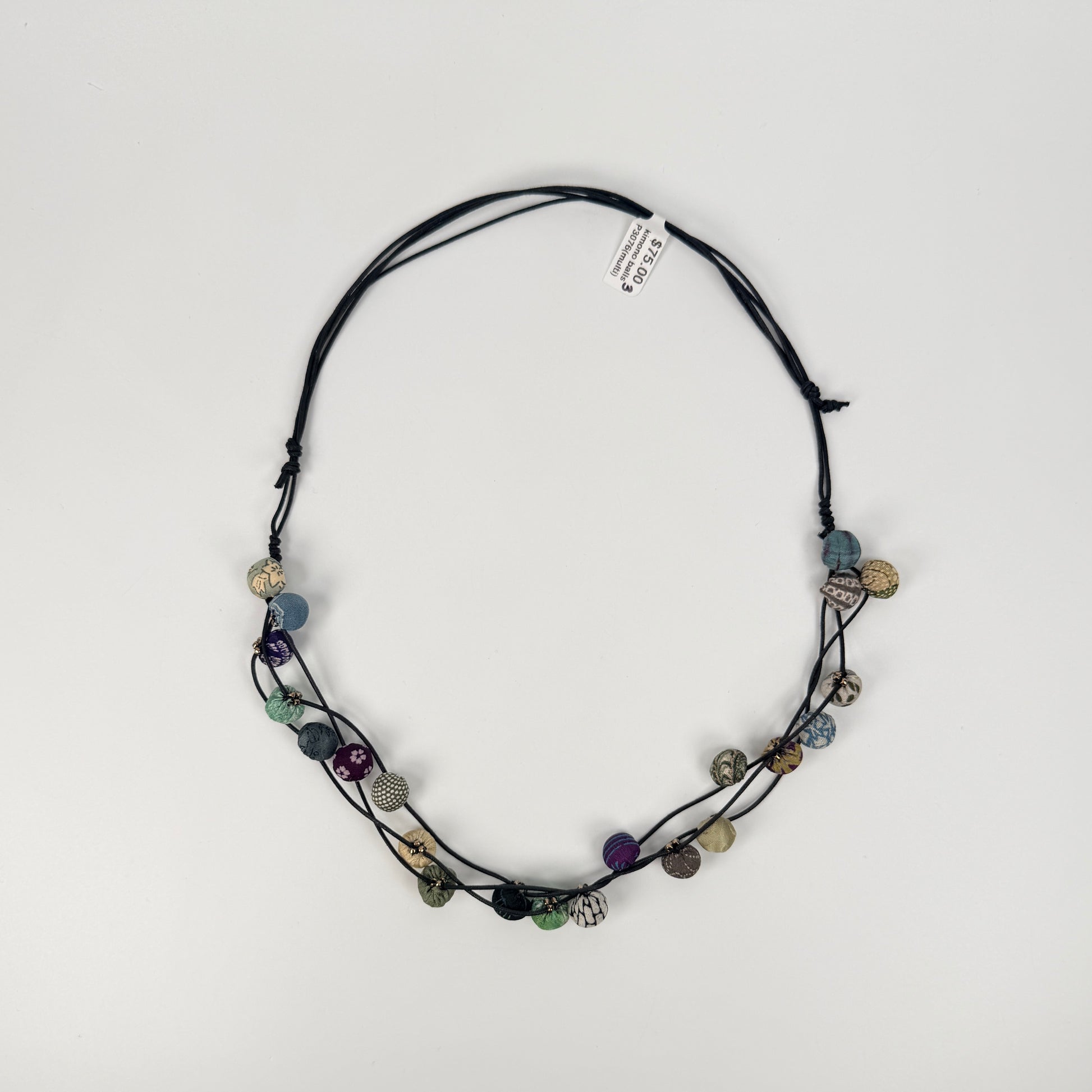 This Handmade Vintage Kimono Multi-Ball Necklace comes straight from our friend Tomoko’s studio in Kyoto, where each bead is hand-sewn from repurposed kimono cloth and finished with tiny stitches and seed beads. It’s a joyful splash of color and texture—lightweight balls that float along the cord, a wearable piece of art celebrating tradition, creativity, and mindful reuse.