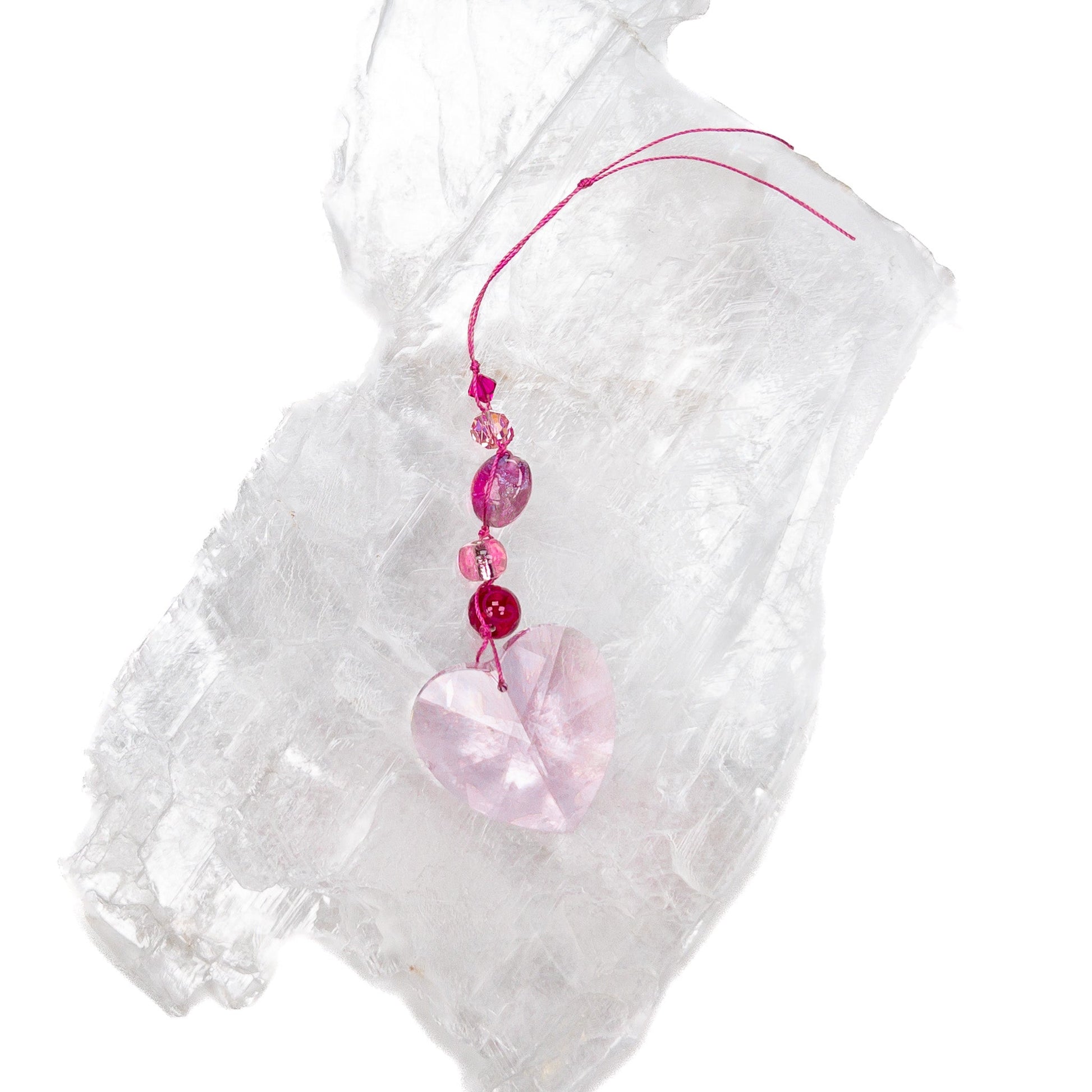 Bring some serious SPARKLE into your life with this sweet light catcher! Featuring a vintage 40mm Swarovski crystal heart in rosaline, and embellished with vintage handmade glass beads that were produced exclusively for the Bead Gallery in the Czech Republic.