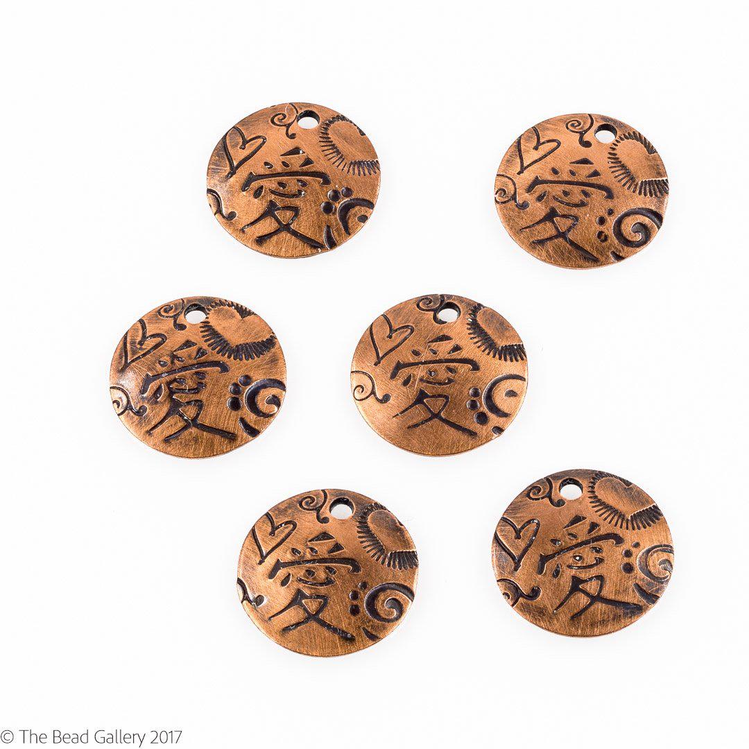 The stamp was custom-made for us with a kanji (Japanese written character for love) designed by a friend! Handstamped with care, these charms are set with the intention of LOVE. Each symbol is meticulously stamped onto the disk at The Bead Gallery, Honolulu with a collage of heart-based symbols.