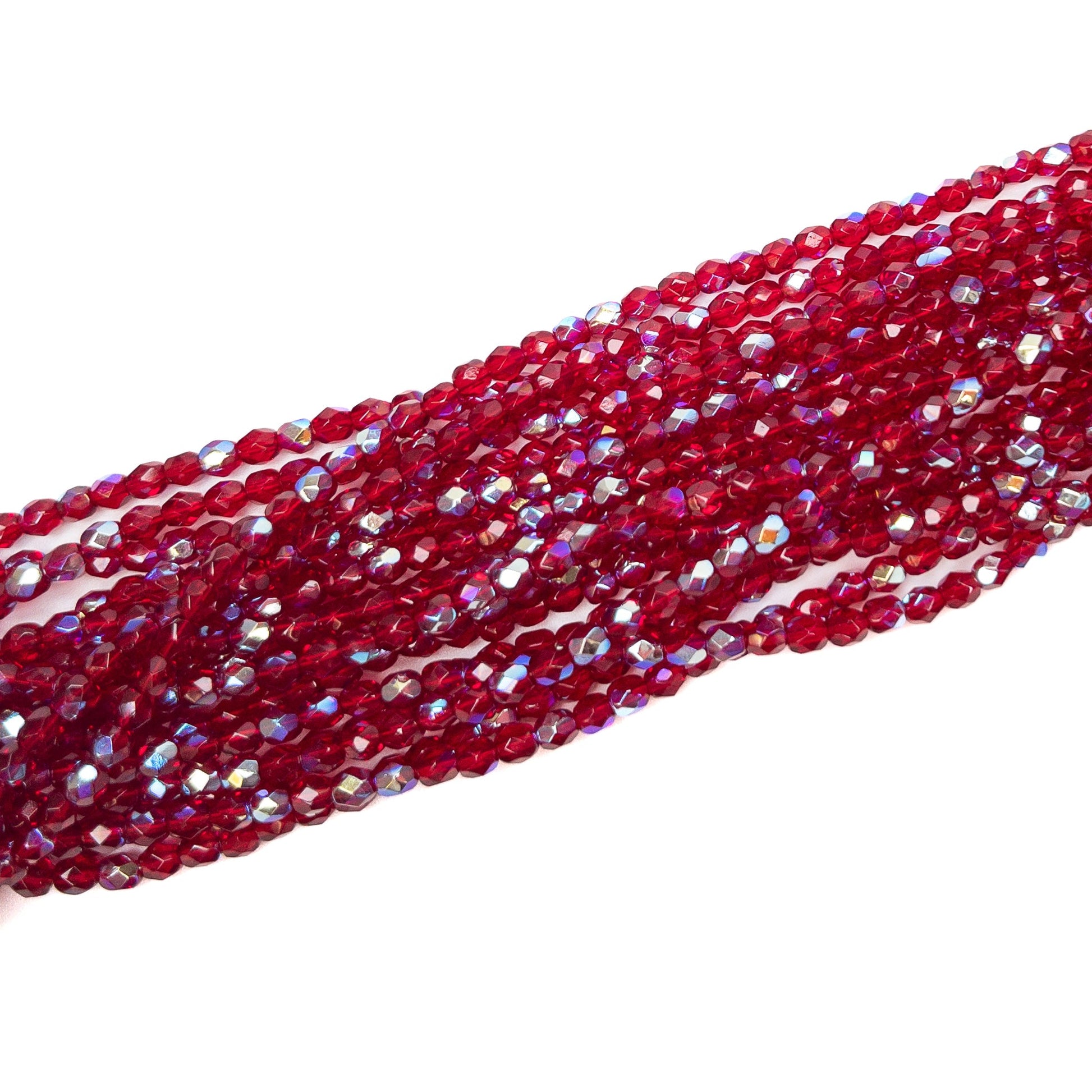 Turn up the sparkle with Medium Ruby AB 4mm Fire Polish Glass Beads—classic Czech faceted rounds in a vivid ruby red with an AB (Aurora Borealis) iridescent glow that flashes gold-pink as they move. Perfect for holiday palettes, romantic designs, and everyday pops of color in bracelets, necklaces, and earrings.