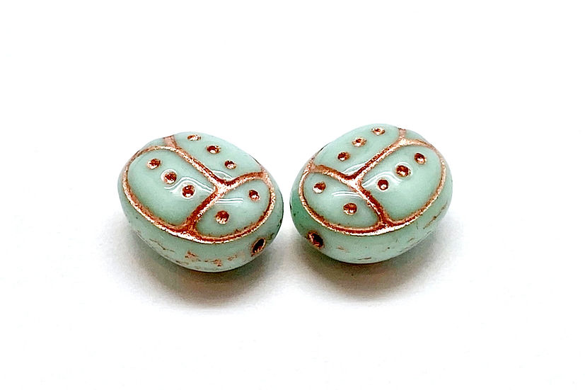 - 12mm Opaque Mint Ladybug Czech glass beads with rose gold wash