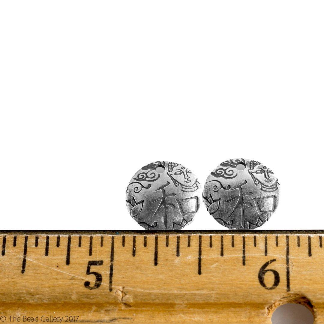 The stamp was custom-made for us with a kanji (Japanese written character for peace) designed by a friend! Each symbol is meticulously stamped onto the disk at The Bead Gallery, Honolulu, with a collage of spiritual symbols that may include: buddha, lotus, spirals, and clouds.
