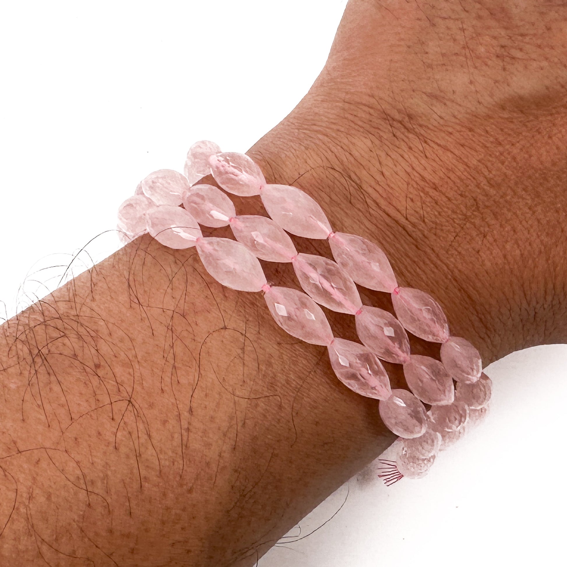 These gorgeous Rose Quartz marquise beads are luminous in soft, pale pink. The 13.5mm faceted shape is stunning, catching the light to create beautiful sparkle. Rose Quartz is the quintessential stone of unconditional love and deep emotional healing. We love stringing strand as a mindful, loving statement piece!