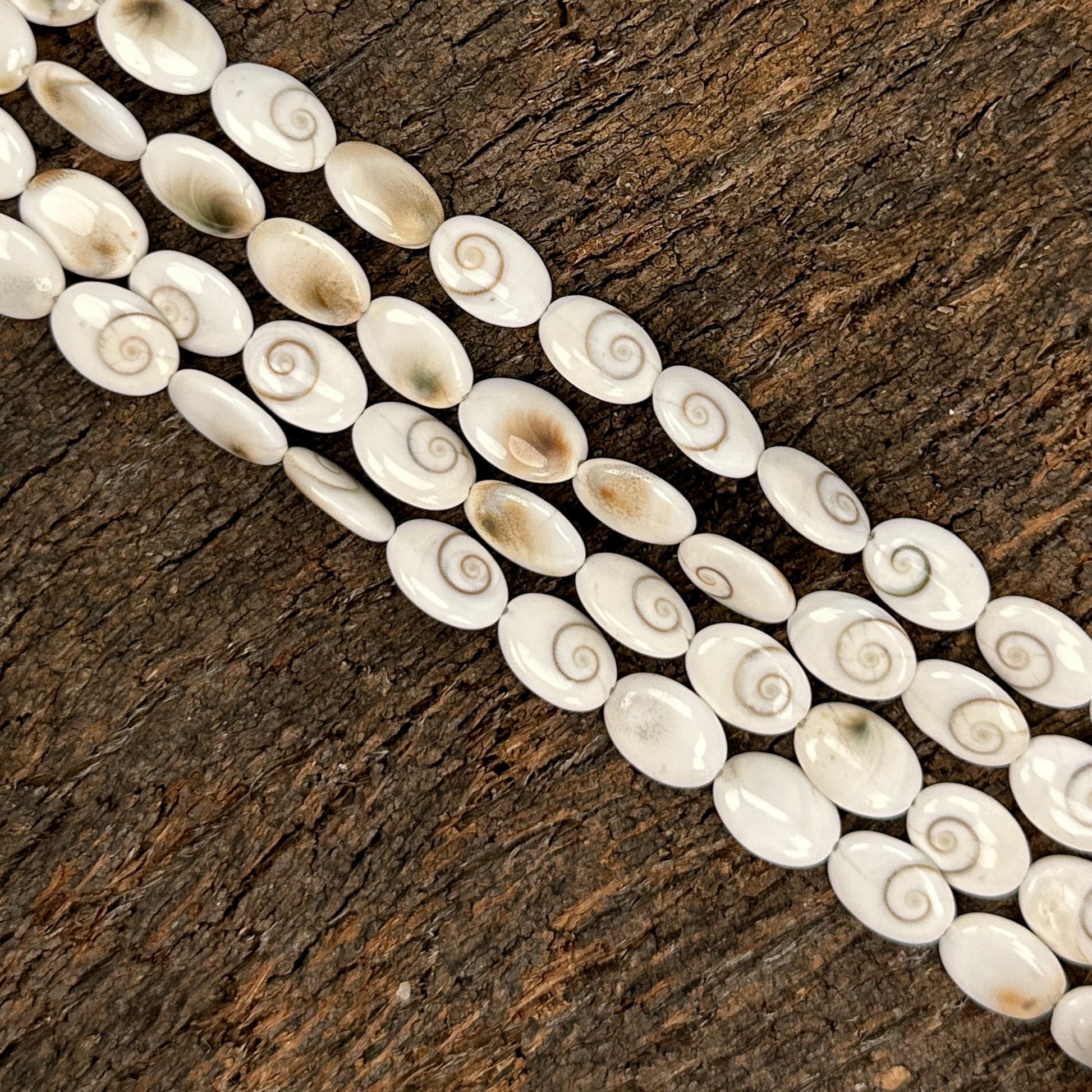 Shiva Eye Conch Shell beads have a naturally formed spiral pattern. The eye spiral is said to bring good luck, serve as a protective talisman, and bring the wearer of the bead clarity and insight.