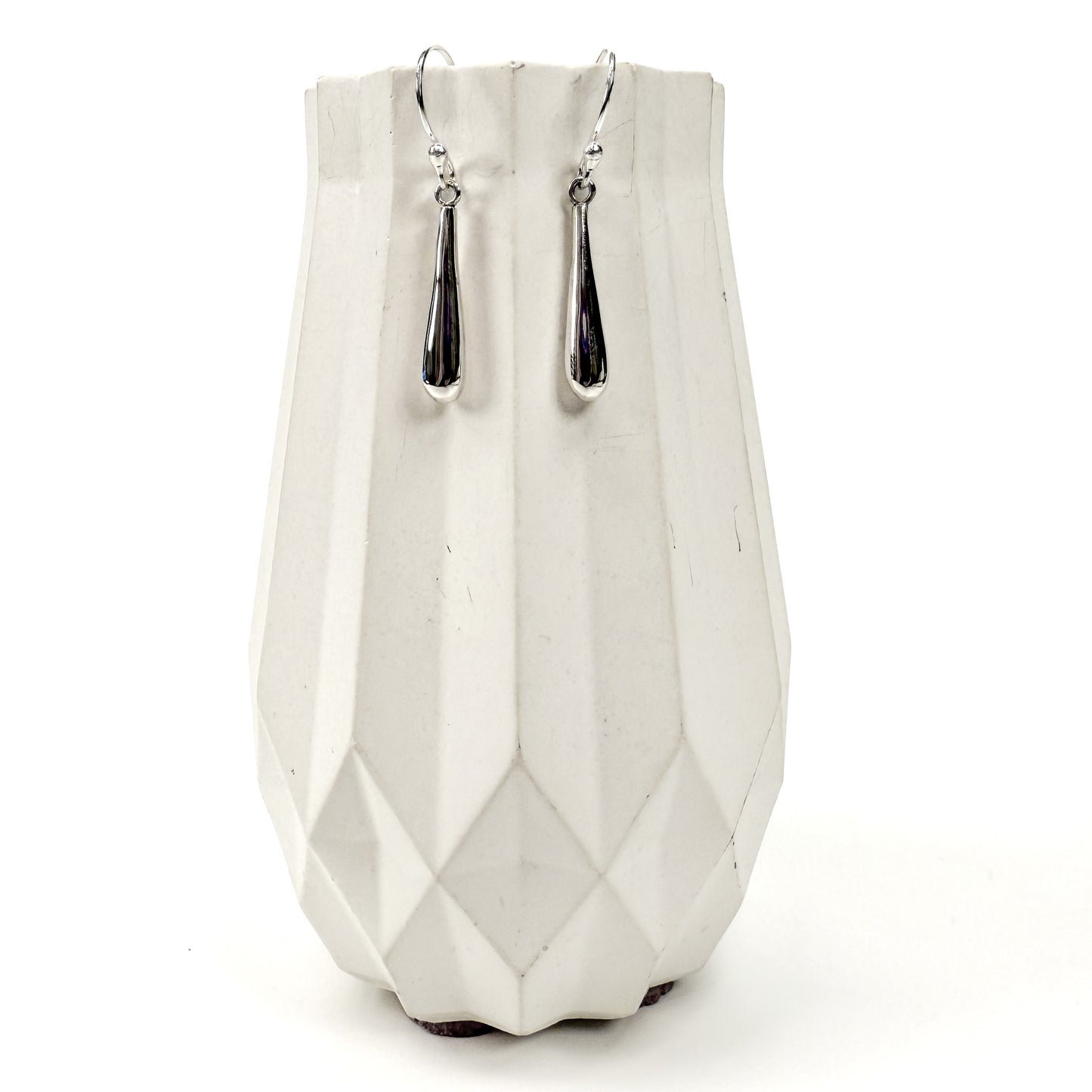 We custom-designed these earrings to our specs and are so pleased so share them with you. We've carried these sleek silver drop earrings for a year, in a longer and shorter style, and wanted one that was JUST RIGHT!! :)