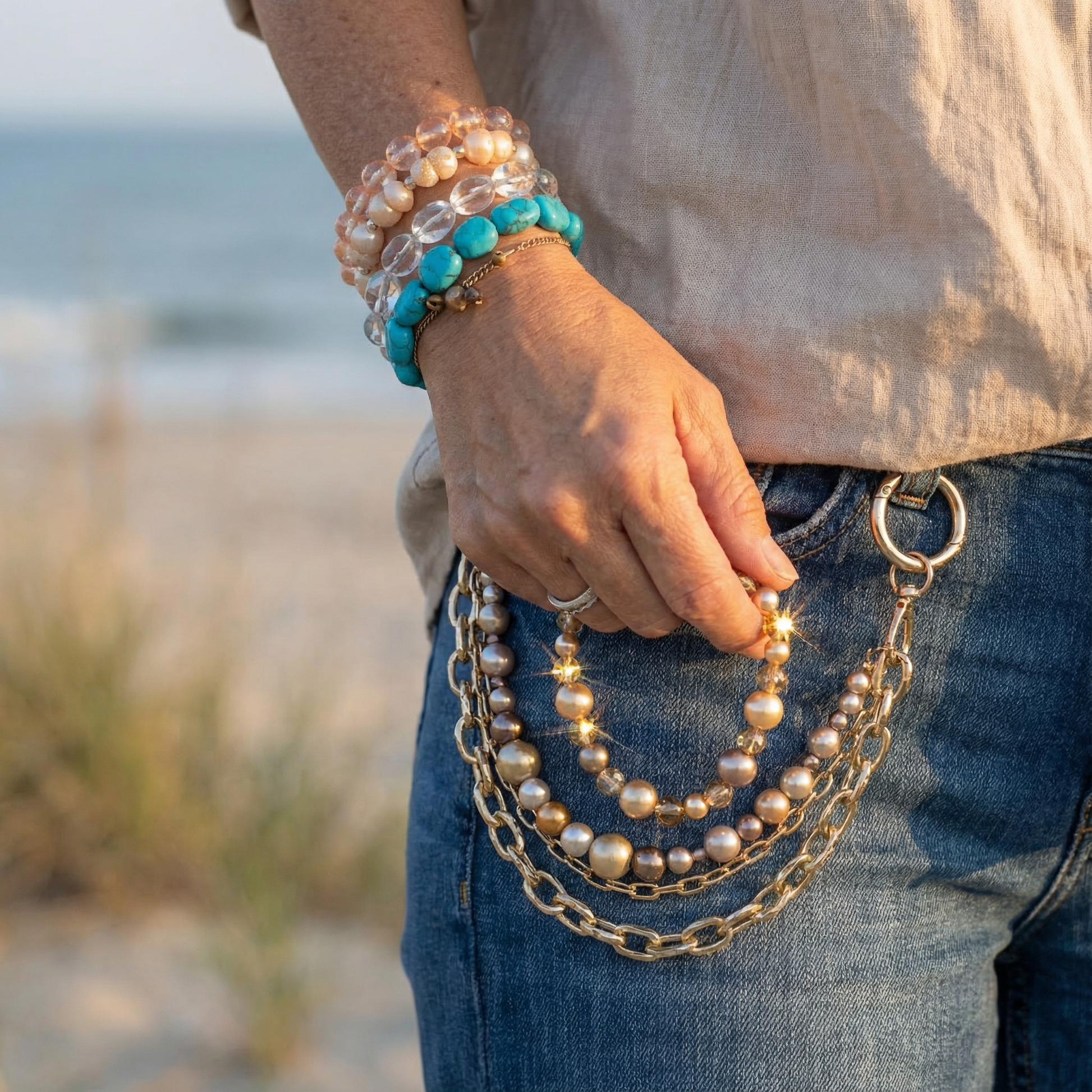 Perfect for a wide range of projects, this versatile mix bag is filled with a nice selection of glass pearls in taupe and golden tones. I made a LV inspired pants jewelry for my very fashion conscious brother with these beads and thick gold chain! I'm wearing it, before I send it off to him :)